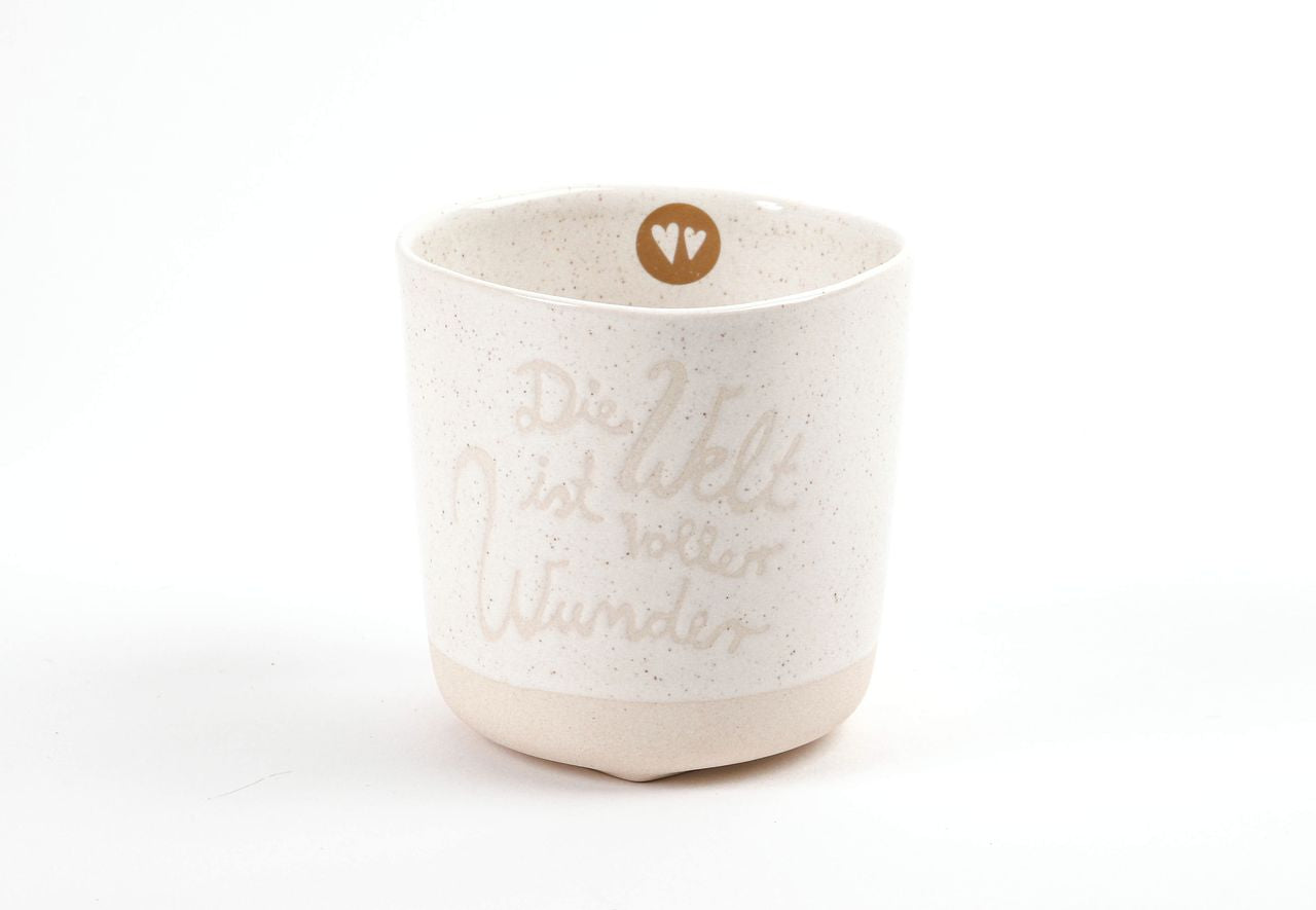 Material: Becher aus Steinzeug mit herzförmigen Standringen, weißer Pünktchenglasur und                   goldenem Decaldruck.