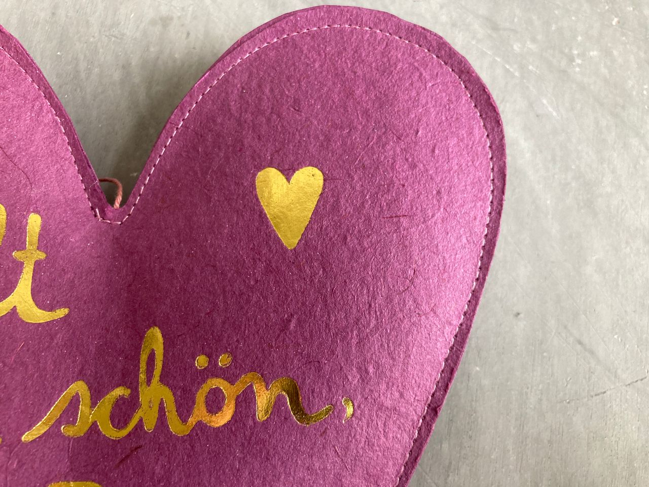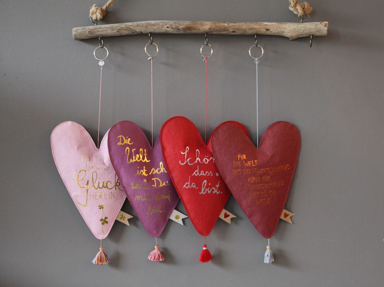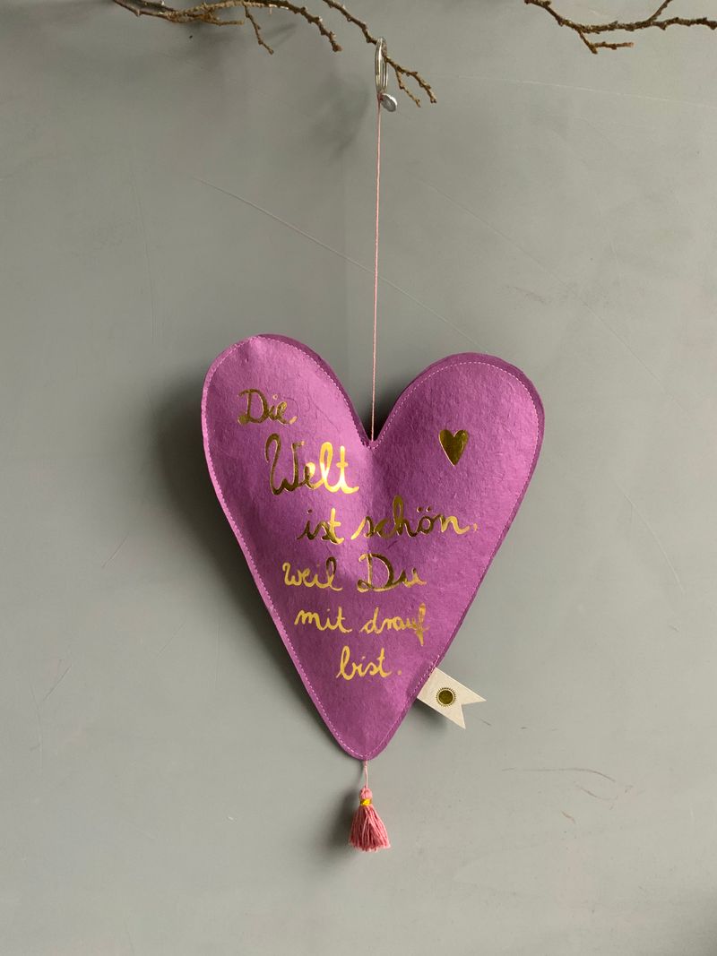 Material: Herzen aus handgeschöpftem Papier mit Heißsiegelung, genäht mit Tag und Druck,                 mit Tassel und Ring zum Aufhängen.