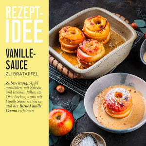 40% Aceto Balsamico di Modena (g.g.A.) (Weinessig, Traubenmostkonzentrat), Dattelsirup, Invertzuckersirup, Glukosesirup, 3,5% Birnensaftkonzentrat, Aroma, Caramelsirup, Branntweinessig, natürliches Vanille Aroma, Antioxidationsmittel: KALIUMMETABISULFIT.